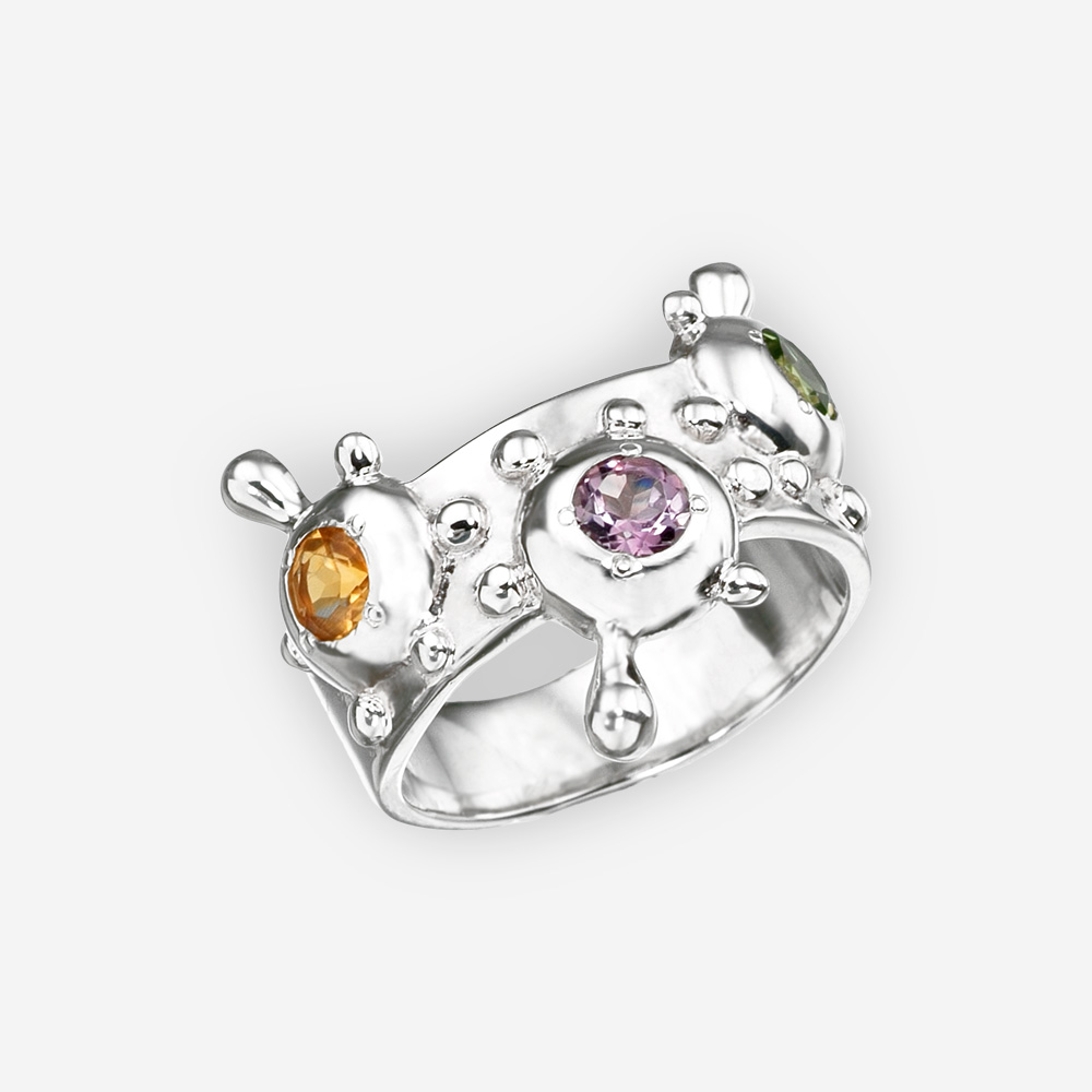 SKU: R-07081Multi-gemstone abstract silver ring featuring abstract drops in sterling silver with amethyst, peridot and citrine gemstones.
